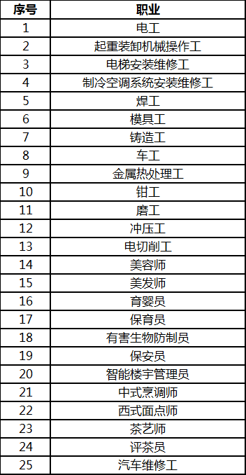 《提高補貼标準職業目錄》(2019年(nián))(共25個)